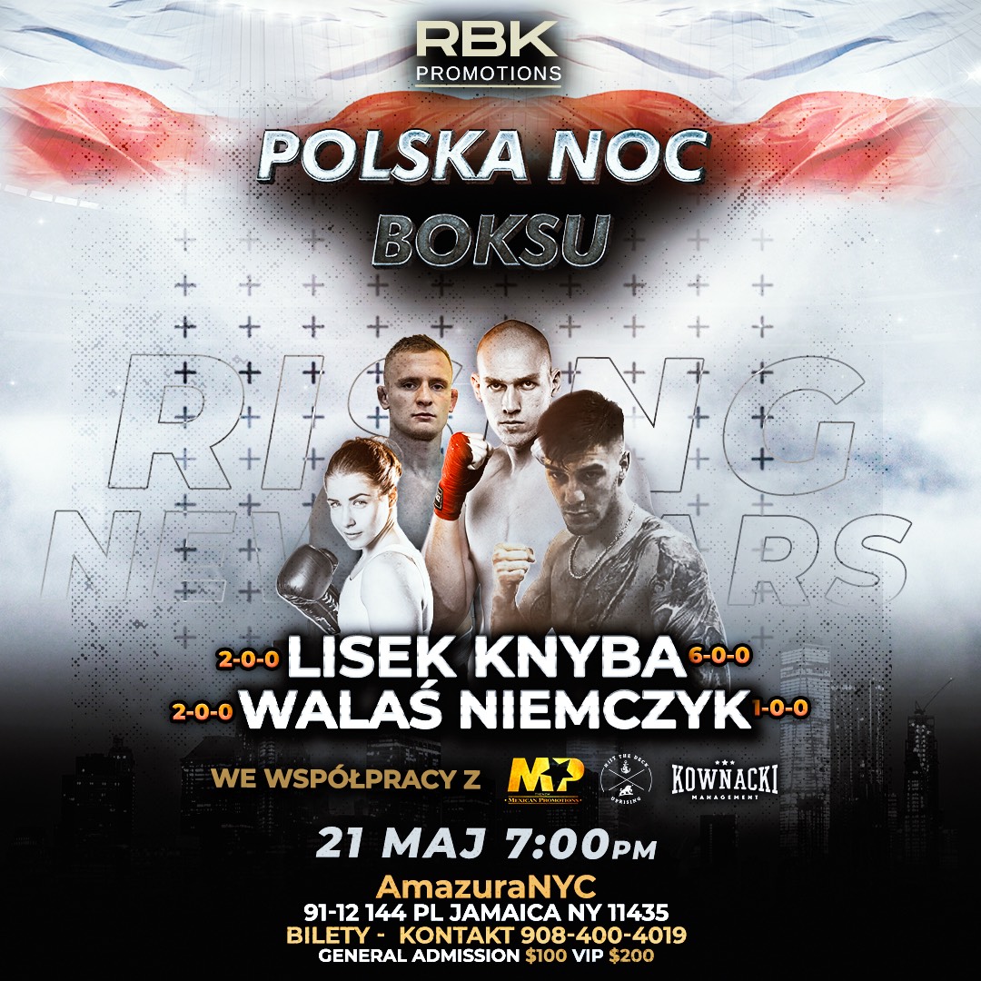 The Gala on May 21 is organized by two of Pulaski Association of Business members Lukasz Kownacki ( Kownacki Promotions ) and Eryk Rachwal ( RBK Promotions). The Polish boxing night will feature four boxers out of Poland : Witold Lisek , Lukasz Niemczyk , Justna Walas and Damian Knyba as the main event.